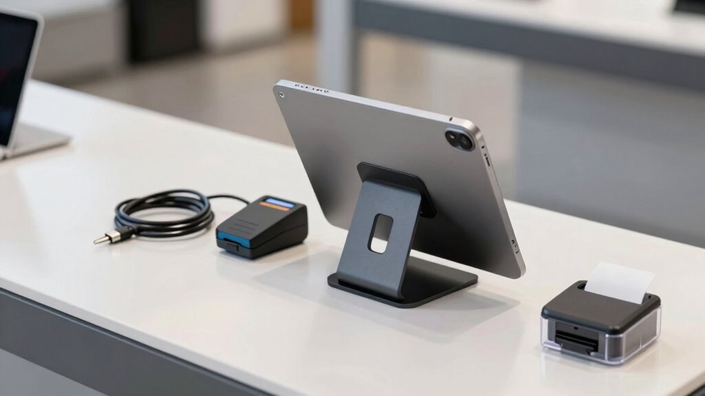 Beyond software compatibility and mobile payments, you should also consider the hardware’s durability and design. Your POS setup will likely be used daily, so look for sturdy construction and flexible mounting options to withstand the busy environment of your business. A sleek, compact design helps save space and makes the setup more visually appealing to customers. Easy-to-use peripherals like barcode scanners, cash drawers, and receipt printers are also worth considering, especially if they can connect effortlessly with your iPad and existing hardware. Additionally, understanding hardware reliability can help you choose components that minimize downtime and maintenance costs. Knowing about space-saving solutions can further assist in optimizing limited retail or restaurant environments. Incorporating upgradable components into your selection can also extend the lifespan of your hardware and adapt to future technological advancements.
