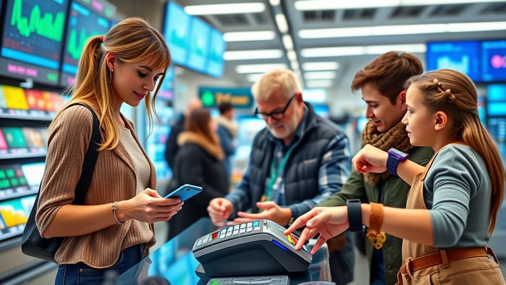 In 2025, Americans are increasingly using digital wallets and contactless payments for their transactions. You can pay by tapping your smartphone or smartwatch at compatible terminals instead of using cash or cards, making payments faster and safer. Security features like tokenization and biometric authentication boost confidence. Retailers widely accept these methods, and they often integrate with loyalty programs. Keep exploring to discover more about how these trends are shaping your everyday financial experiences.