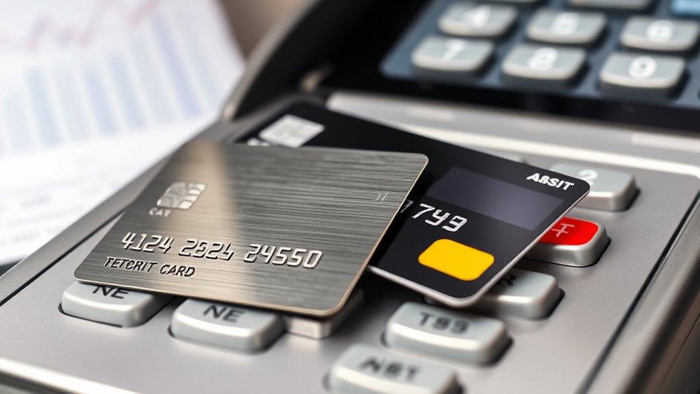 The main reason your fees differ between debit and credit cards is the Durbin Amendment, which caps interchange fees on debit cards to reduce costs for merchants. This regulation keeps debit card fees lower but doesn’t limit credit card fees, which are influenced by other factors like rewards programs and processing costs. Understanding these differences can help you make smarter choices about using each card type and what costs to expect as you spend. There’s more to explore if you want to know the details.